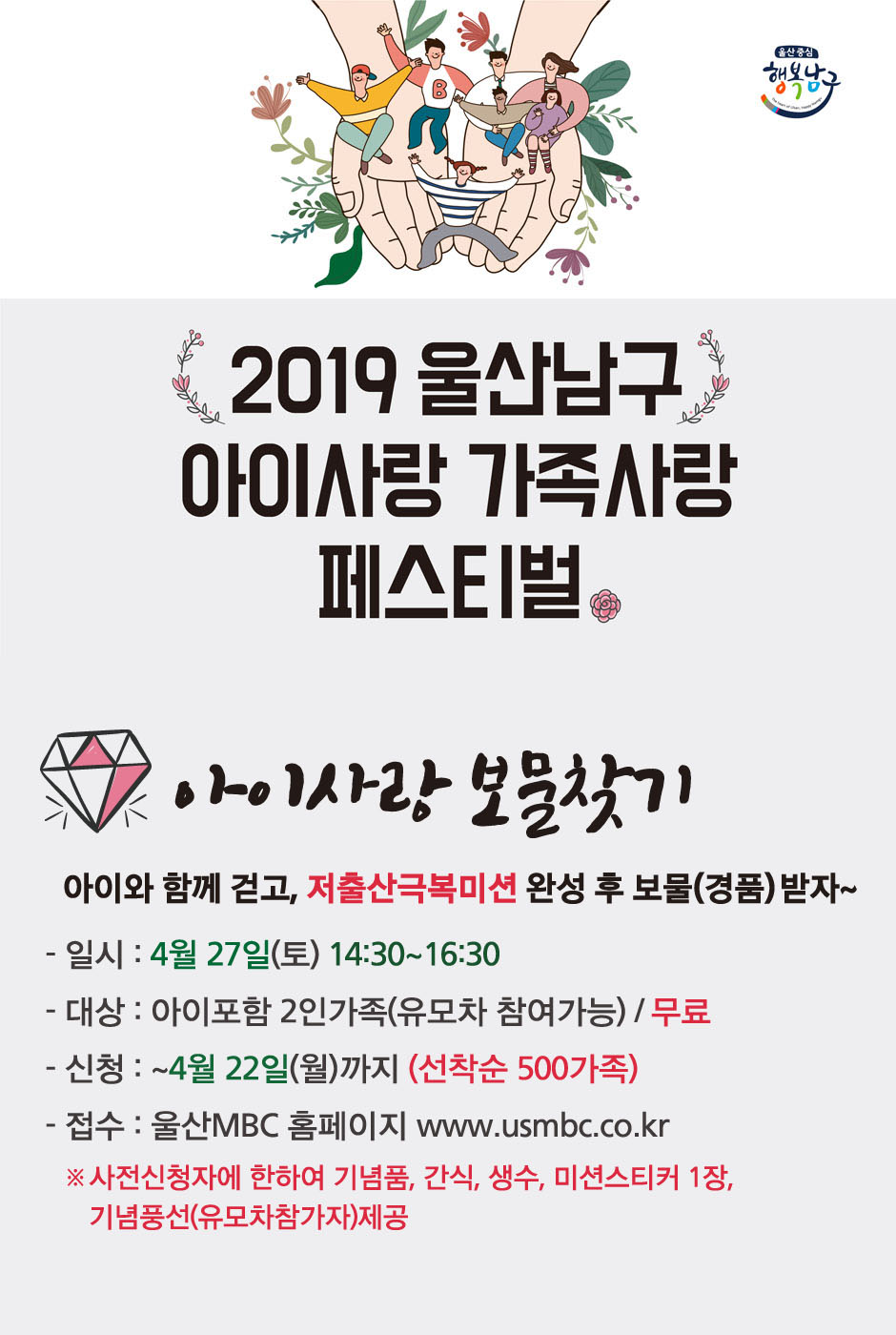 저출산 문제에 대한 인식개선 사업의 일환으로, 출산에 대한 직접장려 보다는 지역사회가 동참하여 사회 문화를 개선하자는 취지의 다양한 가족참여형 행사 프로그램 및 캠페인을 구성하여, 참여 시민을 대상으로 울산남구의 다양한 시책을 홍보하고, 출산과 관련한 가족친화적인 사회문화 확산의 계기를 마련하고자 하였으며 아이 포함 2인가족 대상으로 선착순 500 가족으로 4월 22일까지 신청을 받습니다.