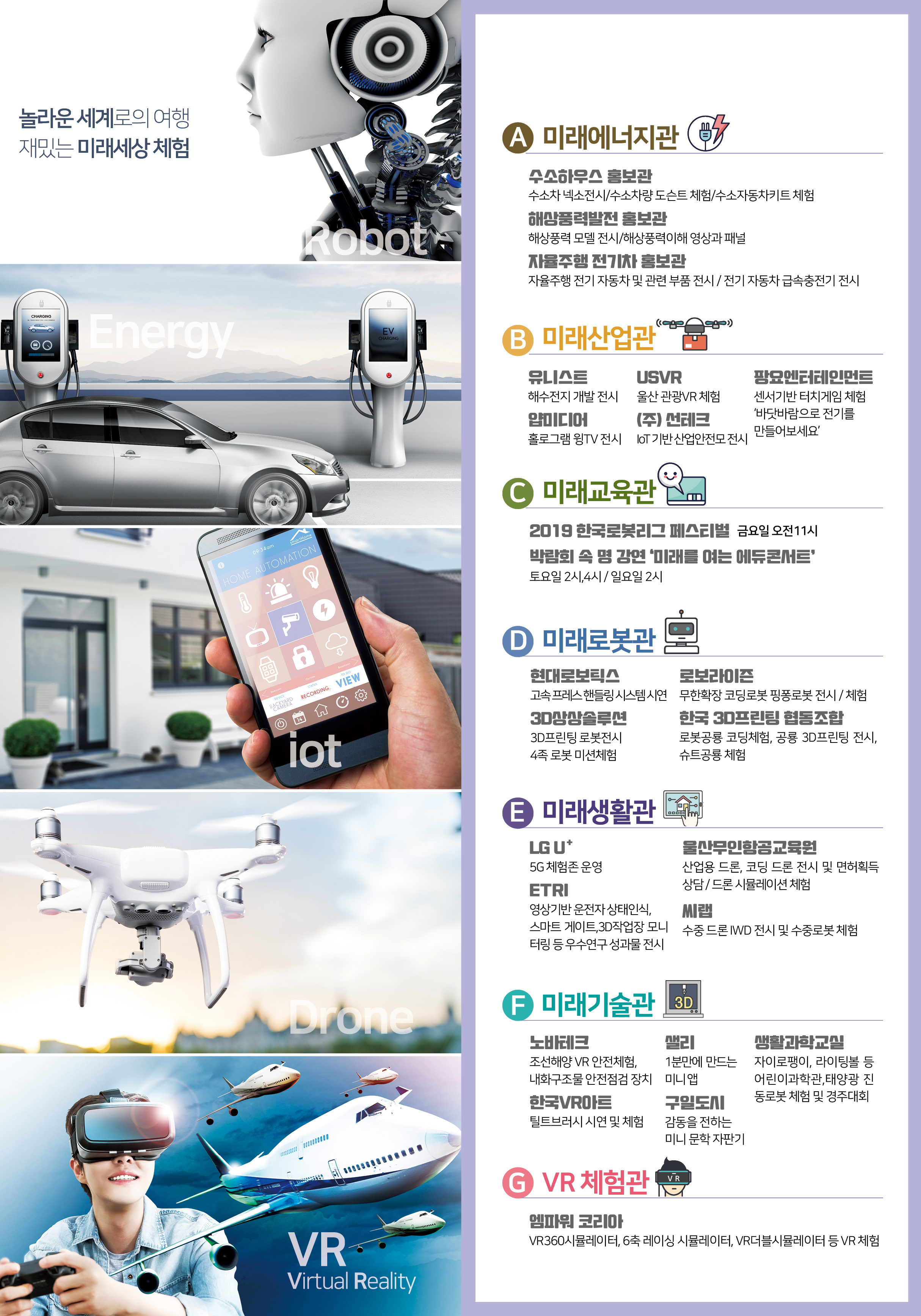 미래에너지관(수소에너지, 해상풍력, 자율주행전기자동차), 미래로봇관(공룡로봇, 로봇암, 3D프린티드로봇) 등
