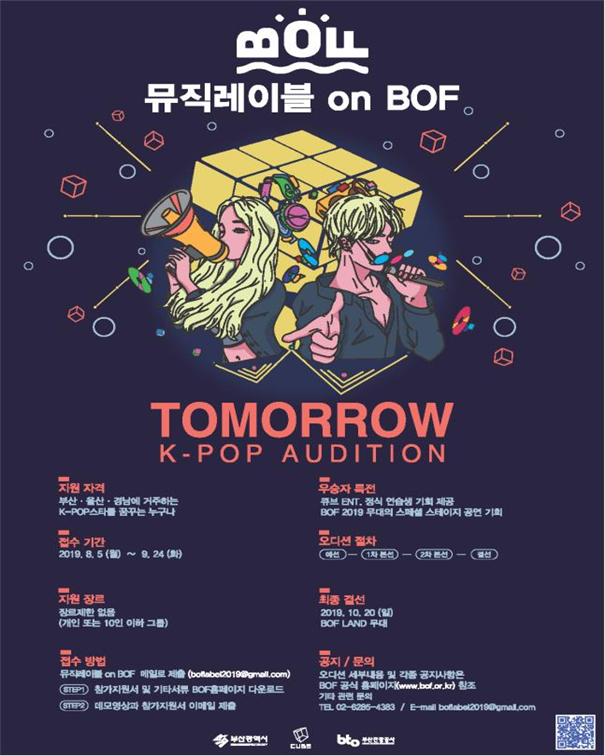 부산시는 ‘2019 부산원아시아페스티벌(Busan One Asia Festival, 이하 비오에프(BOF))에서 미래의 케이-팝(K-pop) 스타를 발굴하는 ‘뮤직레이블 온 비오에프(MUSIC LABEL On BOF)’를 올해 처음으로 선보인다고 밝혔다.