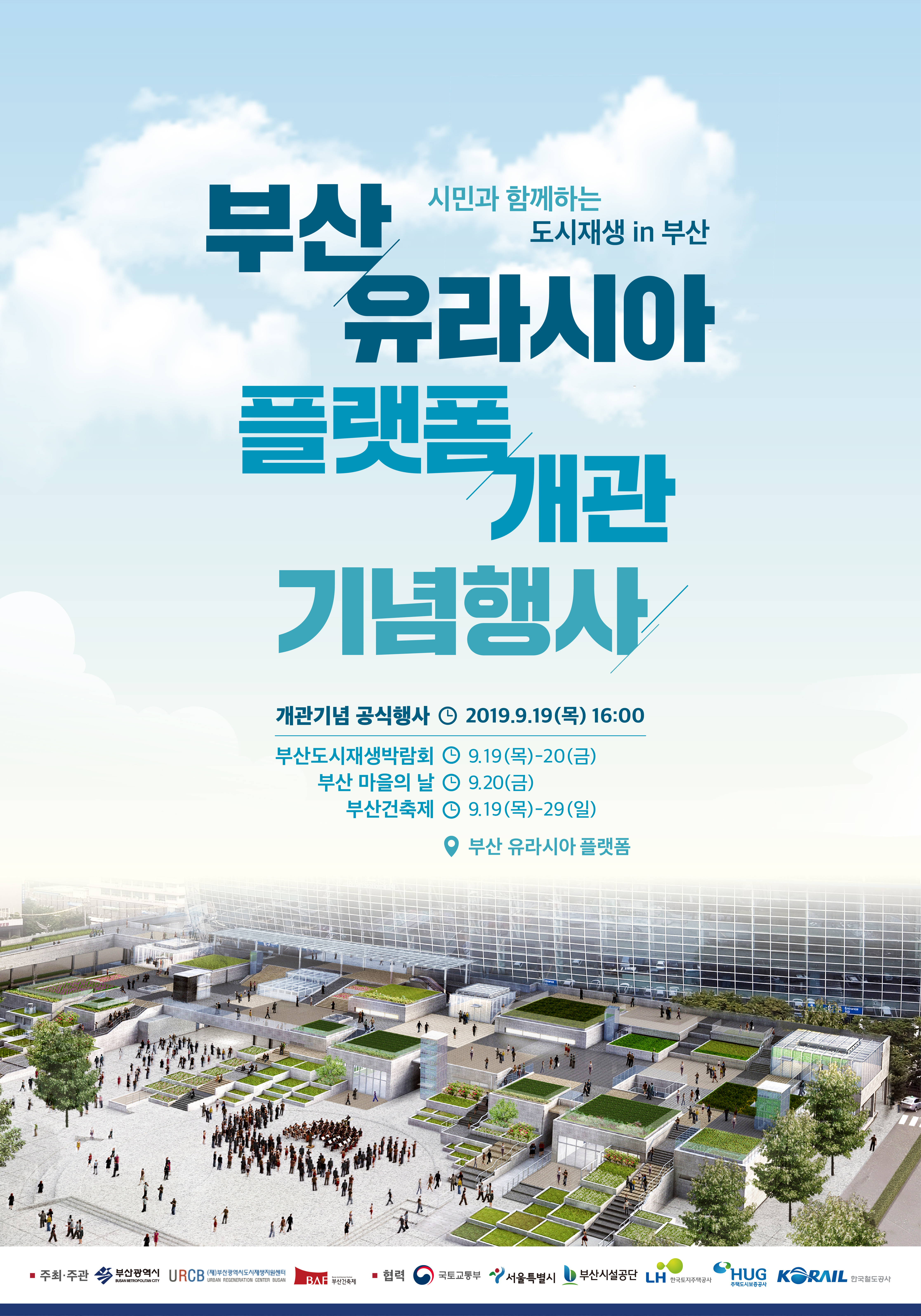부산 유라시아 플랫폼 개관 기념식은 오는 9월 19일에 공식행사가 열리며, 기념식과 함께 부산도시재생박람회와 부산 마을의 날, 부산건축제를 진행한다.