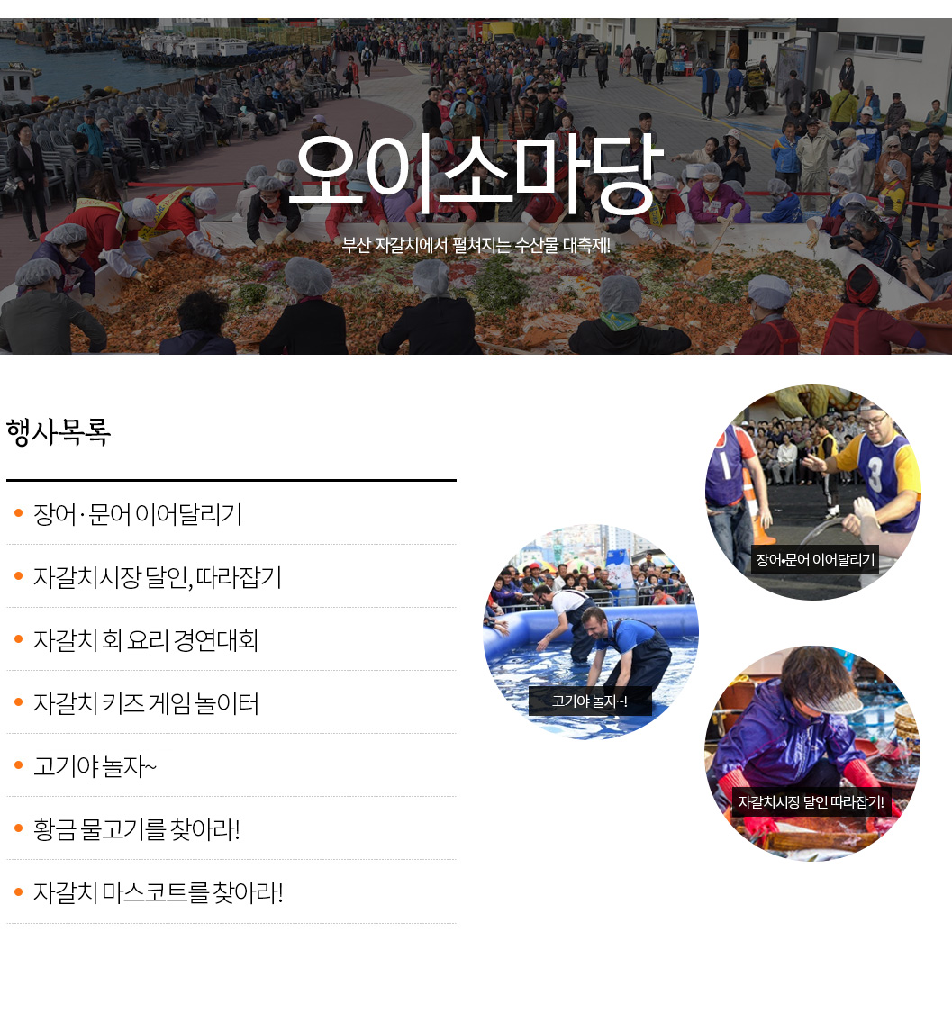자갈치 시장 일원, 유라리광장, 광복로에서 오는 10일부터 13일가지 4일간 펼쳐지는 한국의 독특한 해양수산물 먹거리 축제인 자갈치축제는 싱싱하고 풍성한 수산물과 값싸고 다채로운 살거리, 전통과 현대가 조화된 흥겨움의 극치를 이룹니다.