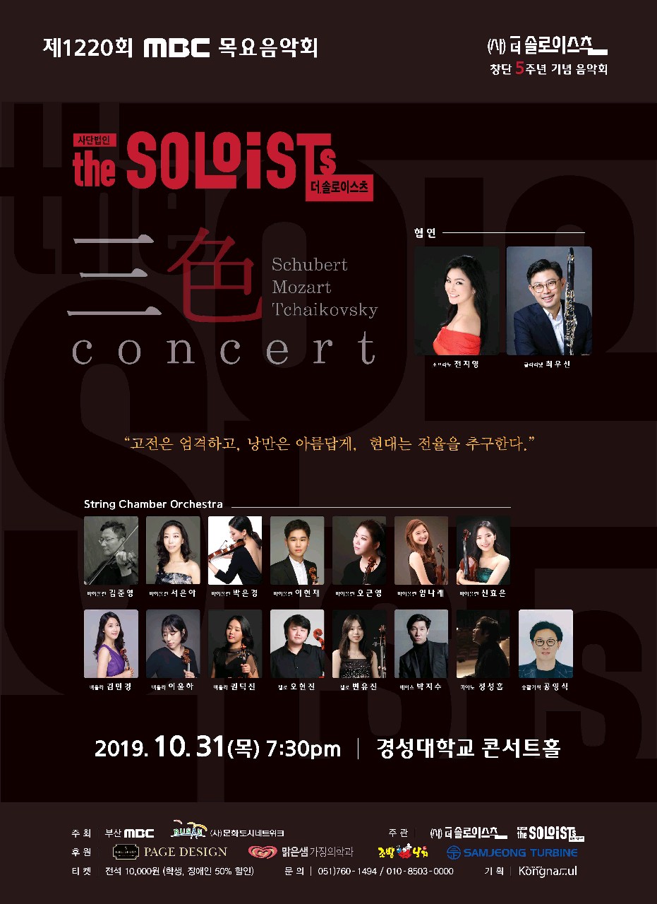더 솔로이스츠 5주년 기념음악회로서 세계적인 소프라노 전지영, 부산이 낳은 줄리어드 출신 피아니스트 정성흡, 부산을 대표하는 클라리넷 연주자 최우선 trio 협연으로 진행합니다. 스트링 챔버의 연주에 클라리넷 협연공연을 감상하실 수 있습니다.