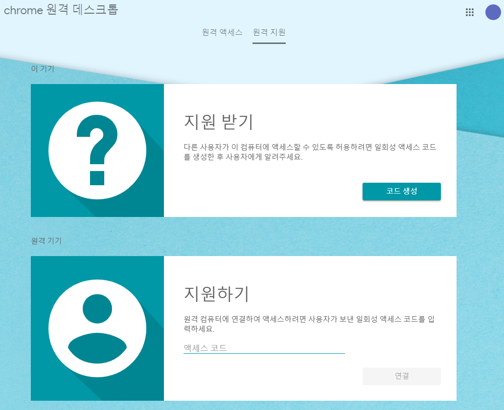 1. 다른 사용자가 이 컴퓨터에 액세스할 수 있도록 허용하려면 원격지원을 클릭 후, 일회성 액세스 코드 생성을 클릭합니다.