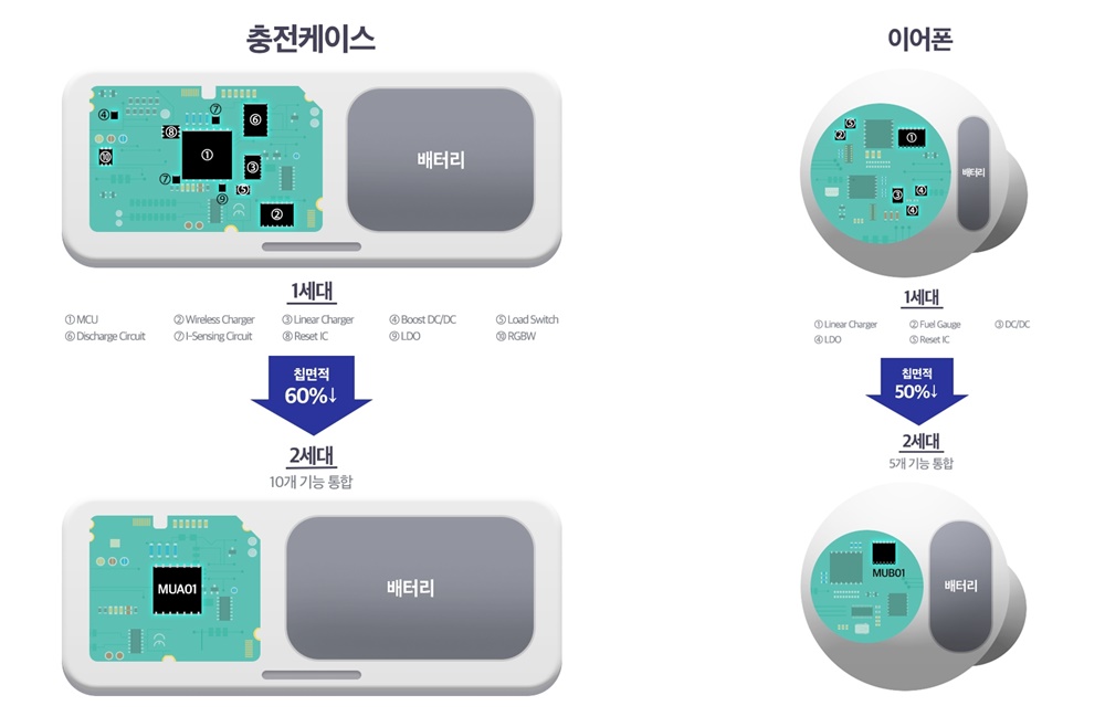 이번에 선보인 전력관리칩은 충전케이스에 탑재되는 ‘MUA01’과 이어폰용 ‘MUB01’이다. 각각 10개, 5개 내외의 다양한 칩들을 하나로 통합한 ‘All in One’ 칩으로 보다 넓은 배터리 공간을 설계할 수 있게 한다.