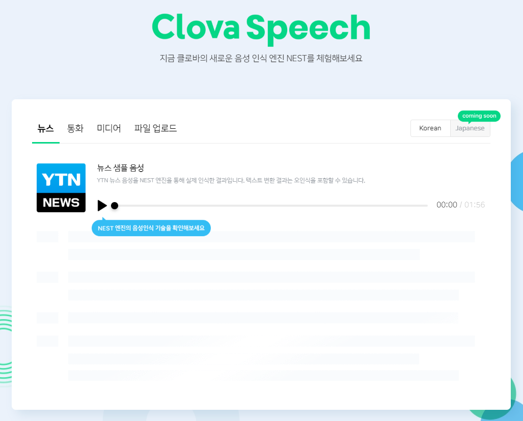 13일 네이버는 길고 복잡한 문장을 인식하고 이를 텍스트로 변환할 수 있는 새로운 음성인식 엔진을 클로바 홈페이지에 공개했다. 이 엔진에는 네스트(NEST, Neural End-to-end Speech Transcriber) 기술이 활용됐다. '심층 신경망 통합 모델링 음성 자동자막 생성 기술'로, 지난 1월부터 네이버 동영상 뉴스 등 일부 서비스에서 도입됐다가 이번에 일반 사용자에게도 무료로 공개됐다.