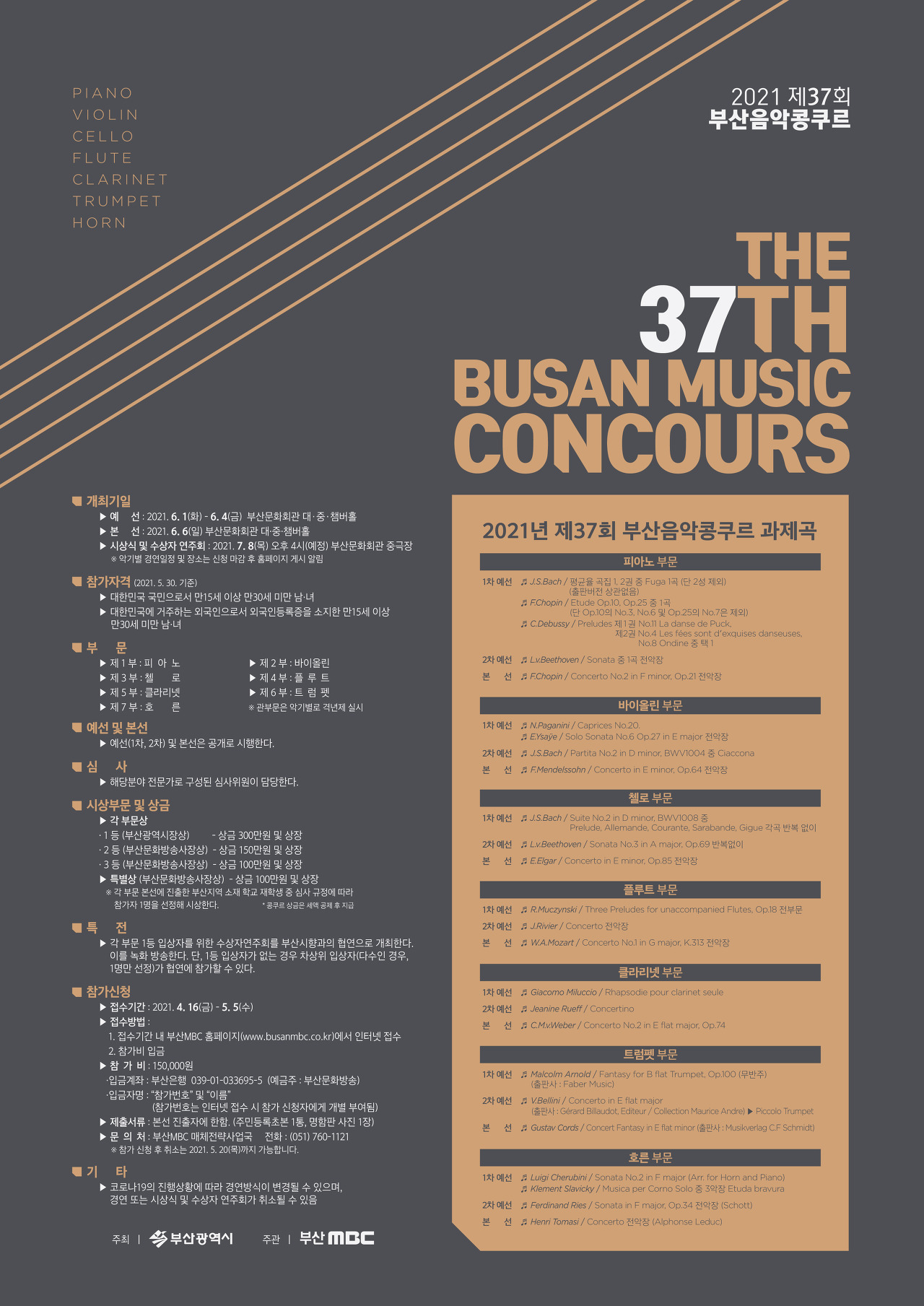 올해로 37회째인 <부산음악콩쿠르>는 36회까지 연인원 6,815명이 참가하고, 643명의 수상자를 배출하여 명실상부한 국내 3대 기악 콩쿠르로 자리 잡고 있습니다.
