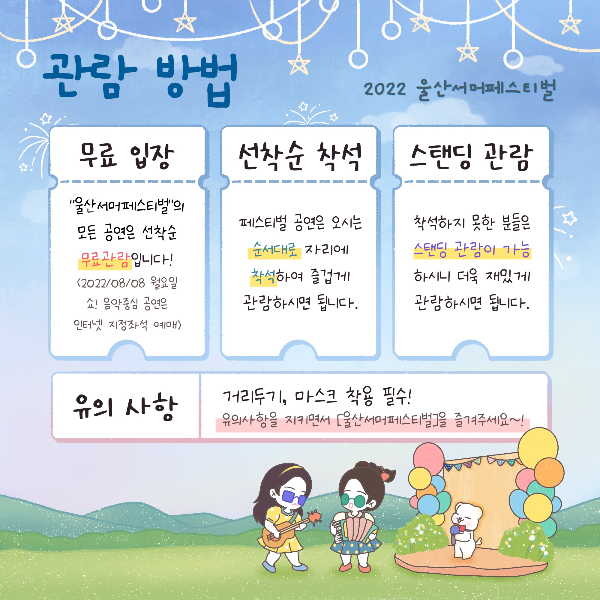 2022 울산서머페스티벌 라인업 및 전체 일정 공개 "울산서머페스티벌"의 모든 공연은 선착순 무료관람입니다. (2022년 8월 8일 월요일에 진행하는 쇼! 음악중심 공연은 인터넷 지정좌석 예매)
